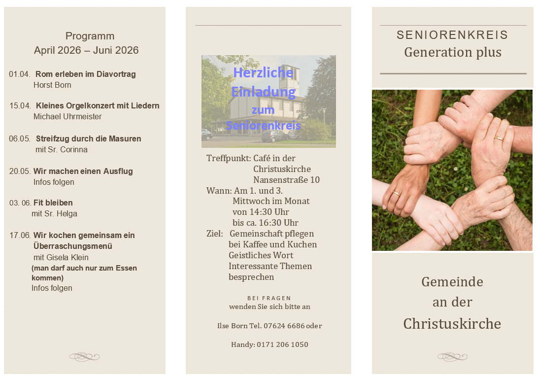 Bei Kaffee und Kuchen gibt es zunächst einmal Zeit für Gespräch und Begegnung. Anschließend wird auf unterschiedliche Weise ein gegenwärtig aktuelles Thema vorgestellt. Wir sehen Lichtbilder, hören Referate, singen aber auch miteinander oder probieren Spiele aus. Zu jedem Nachmittag gehört ein geistlicher Impuls dazu. Über das regelmäßige Programm hinaus gibt es in größeren Abständen gemeinsame Feste und Ausflüge.